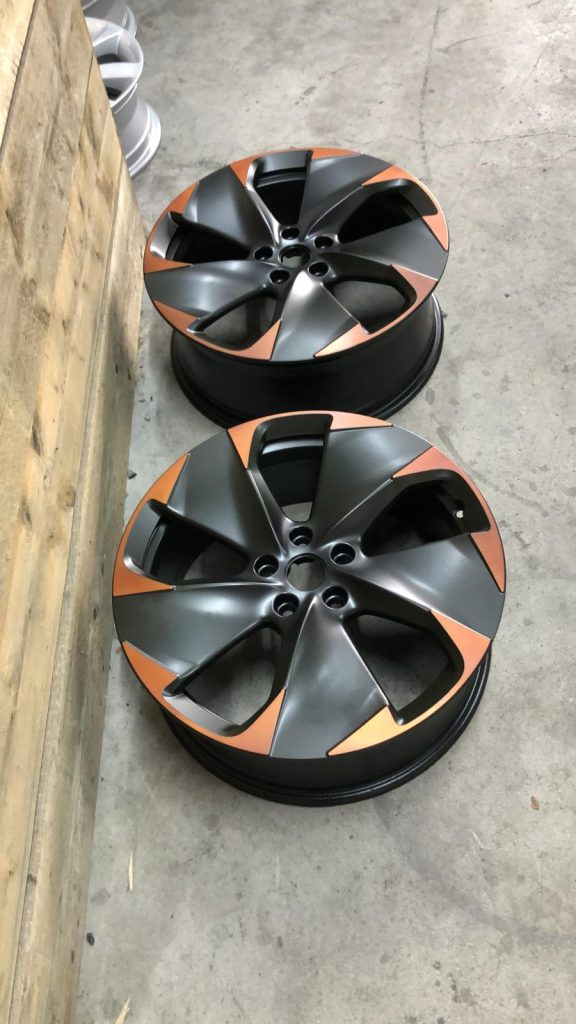 Op verzoek van een van onze klanten deze wielen omgetoverd tot iets speciaals. Onder een donker grijze auto komen deze wielen helemaal tot z’n recht.